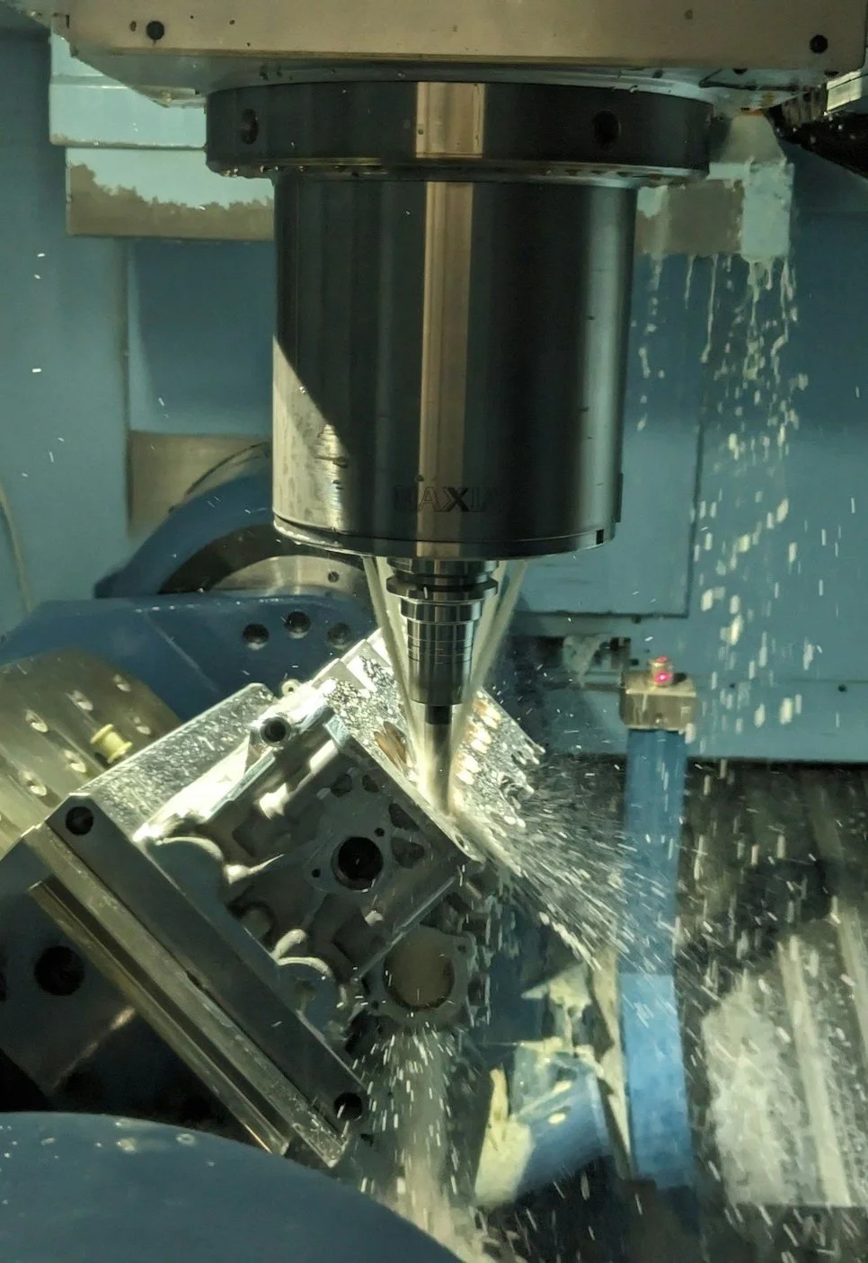 A CNC machine cutting a metal component.